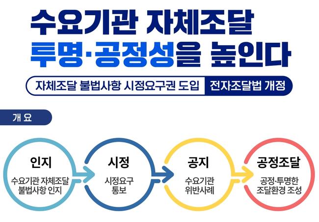 조달청은 전자조달법 개정에 따라 수요기관이 자체적으로 실시하는 입찰 과정에서 법령 위반이나 공정성 훼손 우려가 확인될 경우, 입찰공고 수정이나 계약조건 변경을 공식 요구할 수 있는 시정요구권을 도입해 공공조달의 공정성과 투명성을 강화한다.