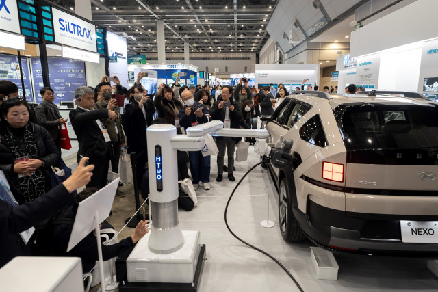 관람객들이 자동 충전 로봇을 활용한 ‘디 올 뉴 넥쏘’ 충전 시연을 바라보는 모습