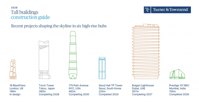 글로벌 전문 서비스 기업 터너앤타운젠드(Turner & Townsend)가 전 세계 6개 도시의 고층건물 시장을 분석한 독특한 관점의 ‘글로벌 고층건물 보고서(Global Tall Buildings Report)’를 발표했다. 터너앤타운젠드의 독자적인 데이터를 기반으로 한 이번 보고서는 서울, 런던, 뉴욕, 도쿄, 뭄바이, 두바이 등지에서 고층건물을 건설하는 개발사들이 직면하는 과제와 기회에 대한 통찰력을 제공하고, 비용 그리고 설계 및 건물의 높이 등이 사업 타당성에 미치는 영향을 분석했다.