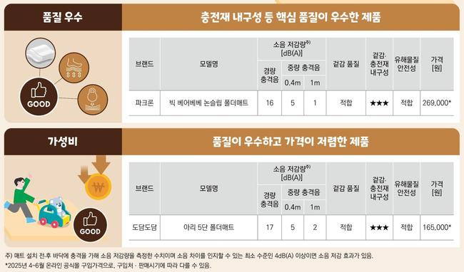 한국소비자원은 소음 저감 성능만으로 제품 우열을 가리기 어렵다는 점을 전제로, 내구성과 미끄럼 방지 같은 사용 품질과 유해물질 시험 결과, 표시 적정성까지 함께 비교해 구매 결정을 할 필요가 있다고 밝혔다.